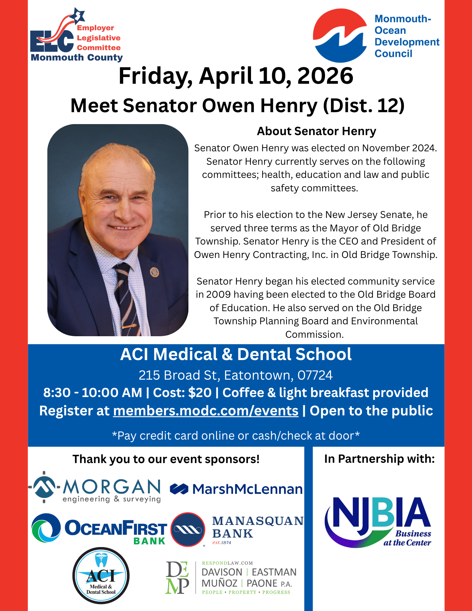 Senator Owen Henry was elected on November 2024. Senator Henry currently serves on the following committees; health, education and law and public safety committees. Prior to his election to the New Jersey Senate, he served three terms as the Mayor of Old Bridge Township. Senator Henry is the CEO and President of Owen Henry Contracting, Inc. in Old Bridge Township. Senator Henry began his elected community service in 2009 having been elected to the Old Bridge Board of Education. He also served on the Old Bridge Township Planning Board and Environmental Commission.