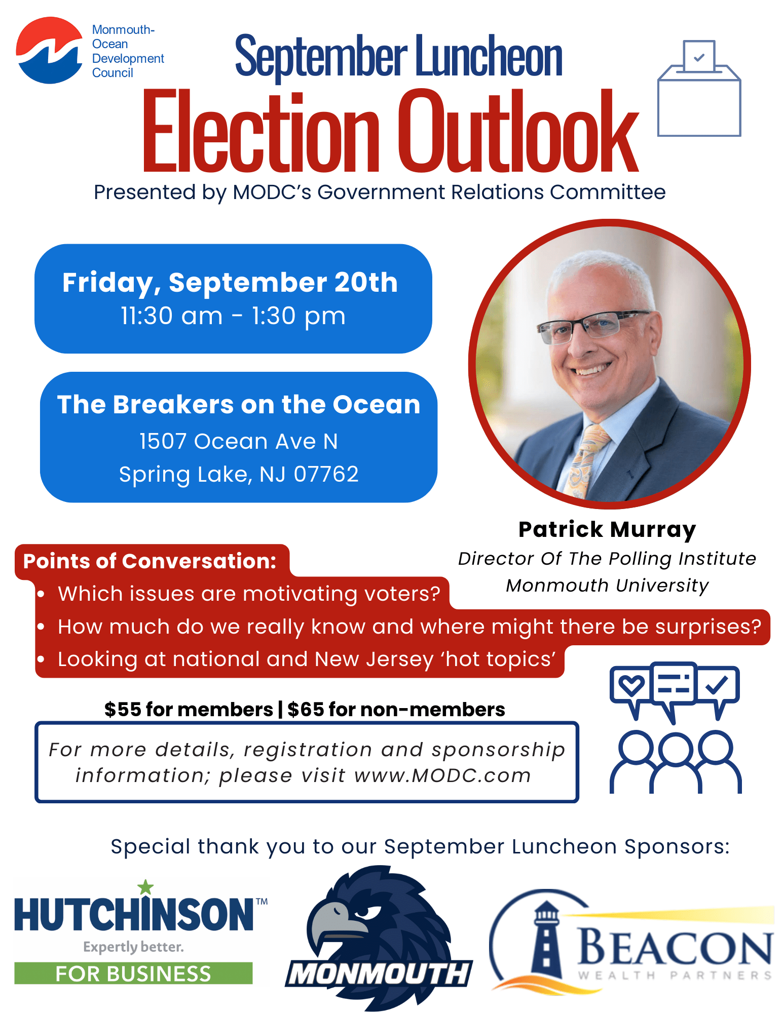 As the presidential election is approaching there are many questions with the future of the country. Join Patrick Murray, Director of The Polling Institute at Monmouth University, as he will discuss what is motivating voters and how 'hot topics' will determine the outcome. Thank you to our September Luncheon sponsors: Monmouth University, Hutchinson and Beacon Wealth PartnersImages