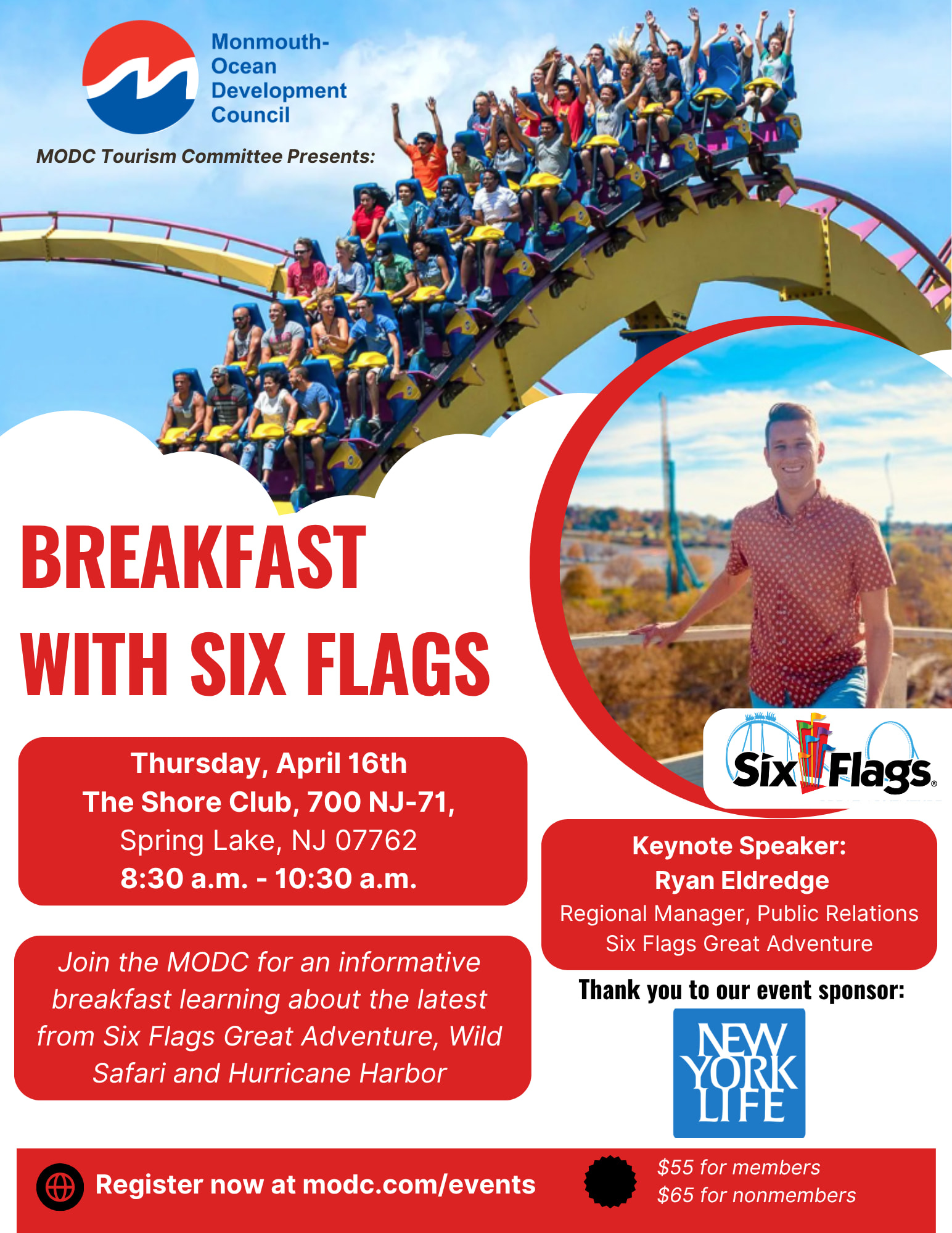Join the MODC for an informative breakfast learning about the latest from Six Flags Great Adventure, Wild Safari and Hurricane Harbor.