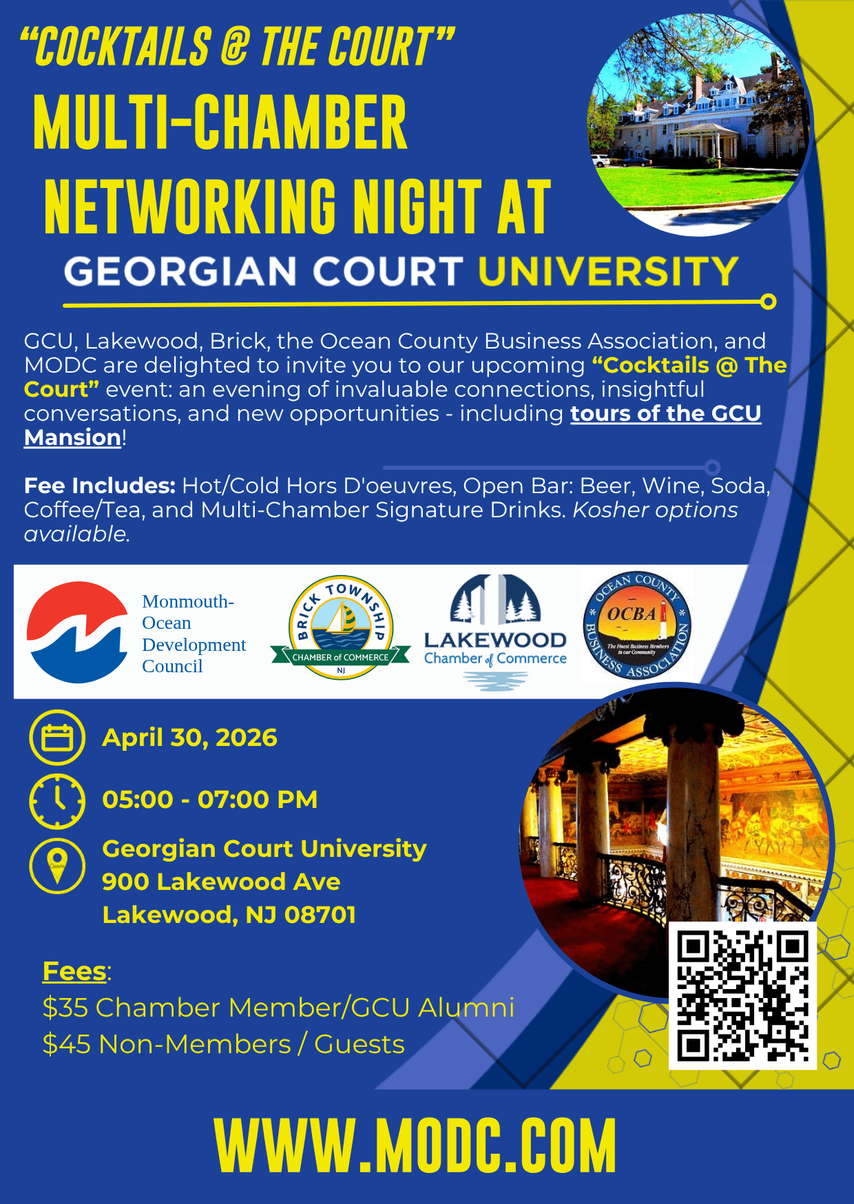 Georgian Court University, Lakewood, Brick, the Ocean County Business Association and the MODC are delighted to invite you to the upcoming Cocktails at the Court event: an evening of invaluable connections, insightful conversations and new opportunities - including tours of the GCU Mansion.