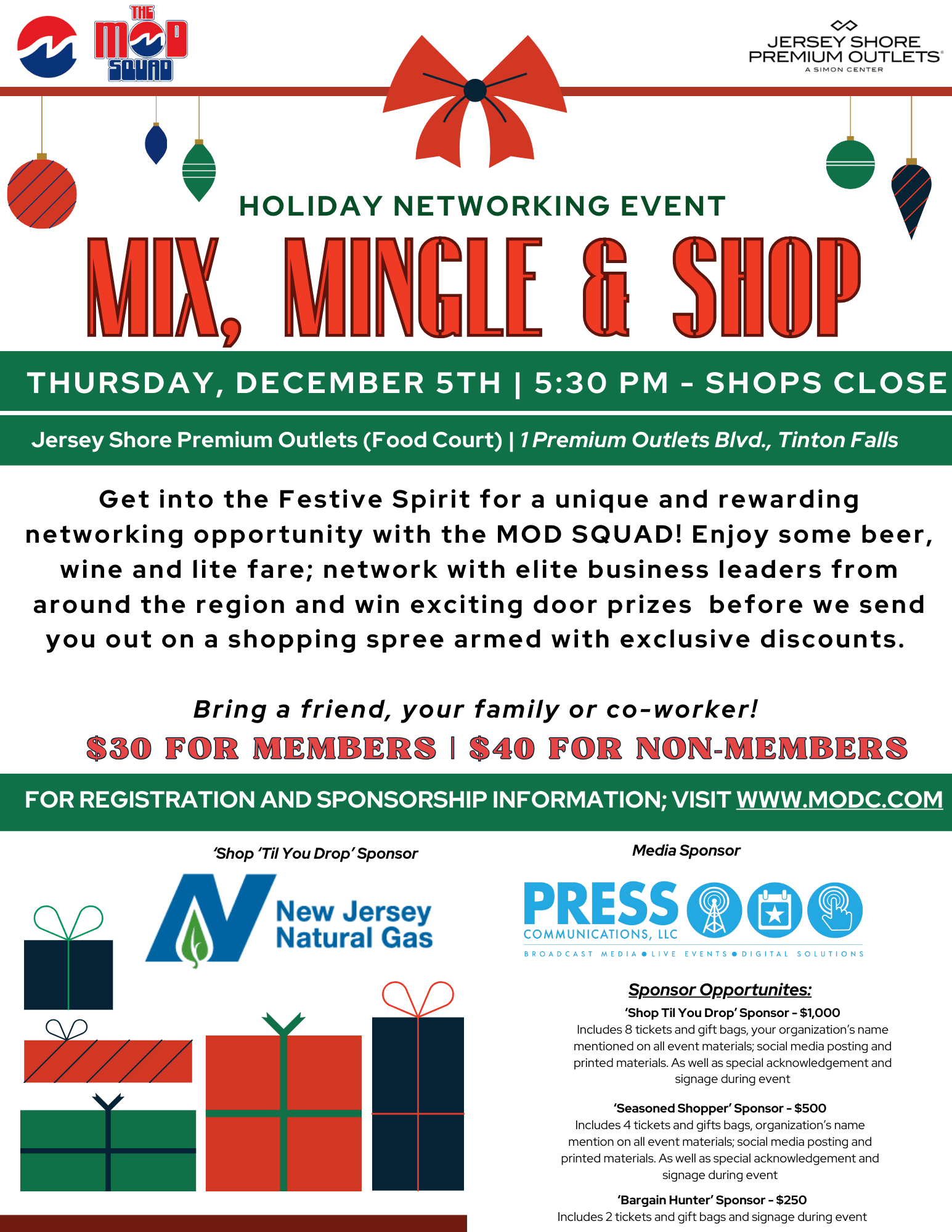 Get into the Festive Spirit for a unique and rewarding networking opportunity with the MOD SQUAD! Enjoy some beer, wine and lite fare; network with elite business leaders from around the region and win exciting door prizes before we send you out on a shopping spree armed with exclusive discounts. Bring a friend, your family or co-worker!